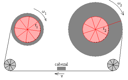 Aunque la velocidad v de la cinta es constante, las velocidades angulares ω1 y ω2 de las ruedas no lo son ya que sus radios r1 y r2 cambian con el tiempo