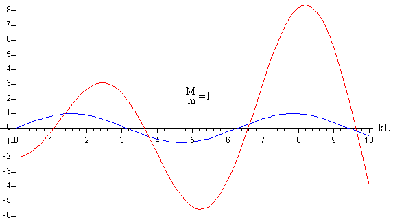 En la figura, se representa la función F1(kL) en color azul y F2(kL) en color rojo. Las intersecciones con el eje horizontal son las raíces de las ecuaciones en este caso, para M/m=1.