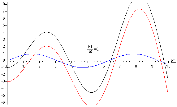 En la figura, se representa la función F1(kL) en color azul y F2(kL) en color rojo y F3(kL) en color negro. Las intersecciones con el eje horizontal son las raíces de las ecuaciones en este caso, para M/m=1.