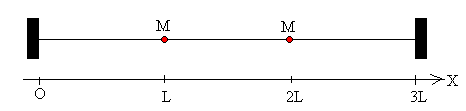Consideremos una cuerda homogénea de longitud 3L y masa 3m con dos masas puntuales M situadas en las posiciones x=L y x=2L tal como se muestra en la figura.